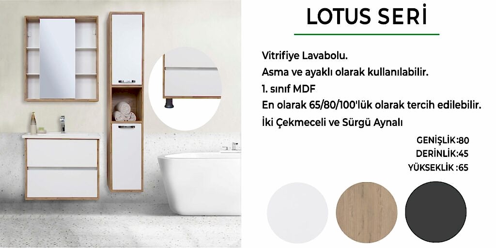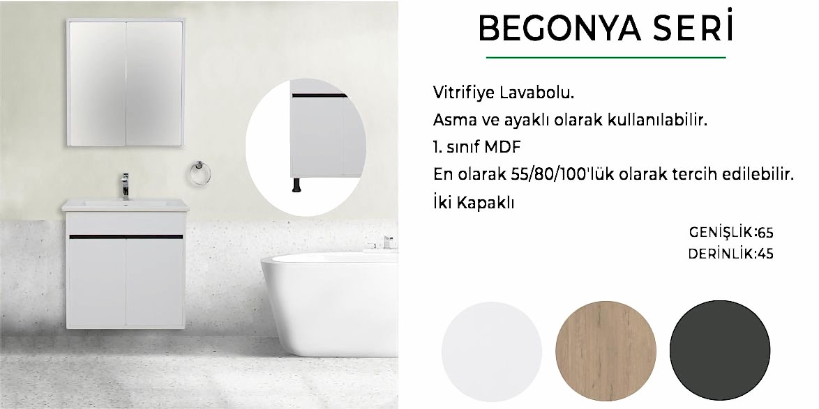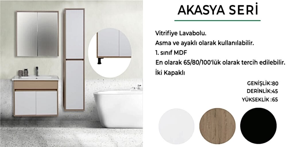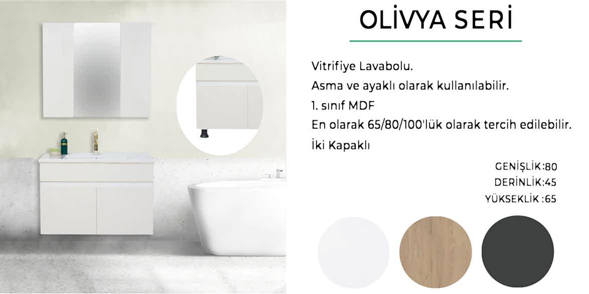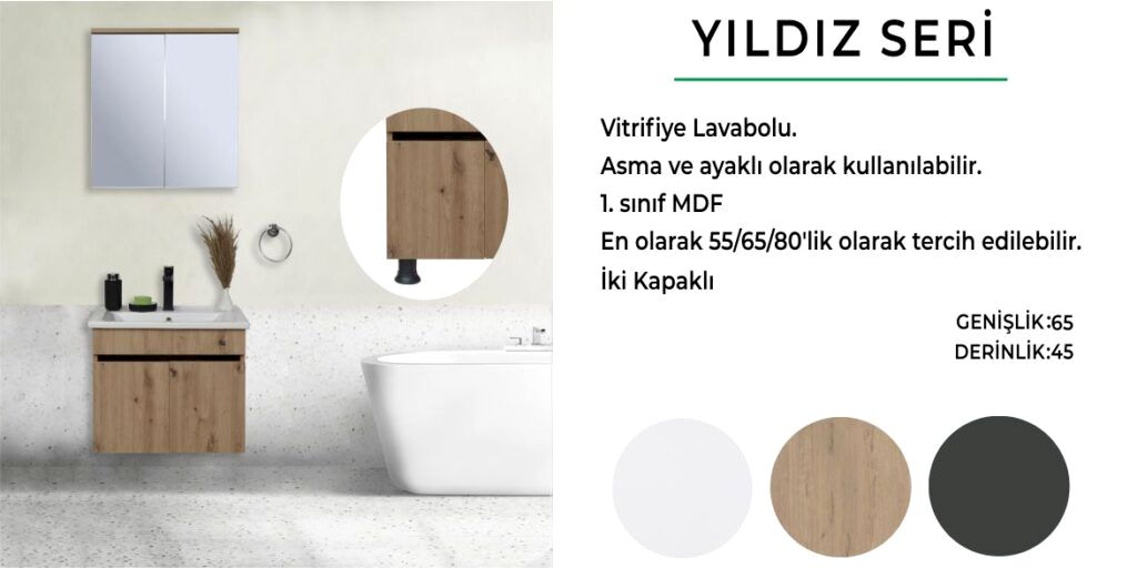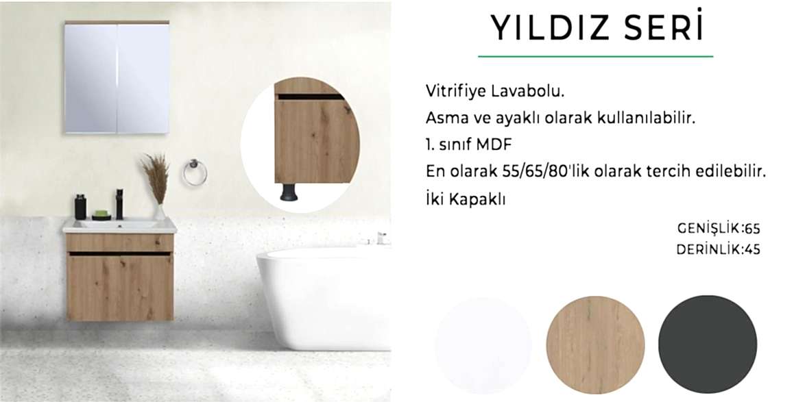 Firmamızda üretilen Banyo Dolapları E1 normundaki 1. Kalite MDF’ den üretilmektedir. Banyo Dolaplarımızda kullanılan tüm aksesuarlar paslanmaz olup standart veya özel üretim şeklinde yapılabilmektedir. Aynı şekilde minifix sistemli veya vidalı olacak şekilde üretim yapılabilmektedir. Kullanılan kenar bantları 1mm olup PVC den mamuldür. Üretimde kullanılan tüm makinalarımız yeni olup en iyi markalardan oluşmaktadır. Sitemizde gördüğünüz standart Banyo Dolaplarımız dışında özel olarak tasarlanmış dolaplarımızda bulunmaktadır. Dolaplarımızda kullandığımız vitrifiye lavabolar 1.Kalitedir. Banyo alt dolaplarımız gizli kulplu veya metal kulplu ve çekmeceli olarak üretilmektedir. Üst dolaplarımızda kullandığımız aynalar 1.sınıf olup tamamıyla bizotelidir.