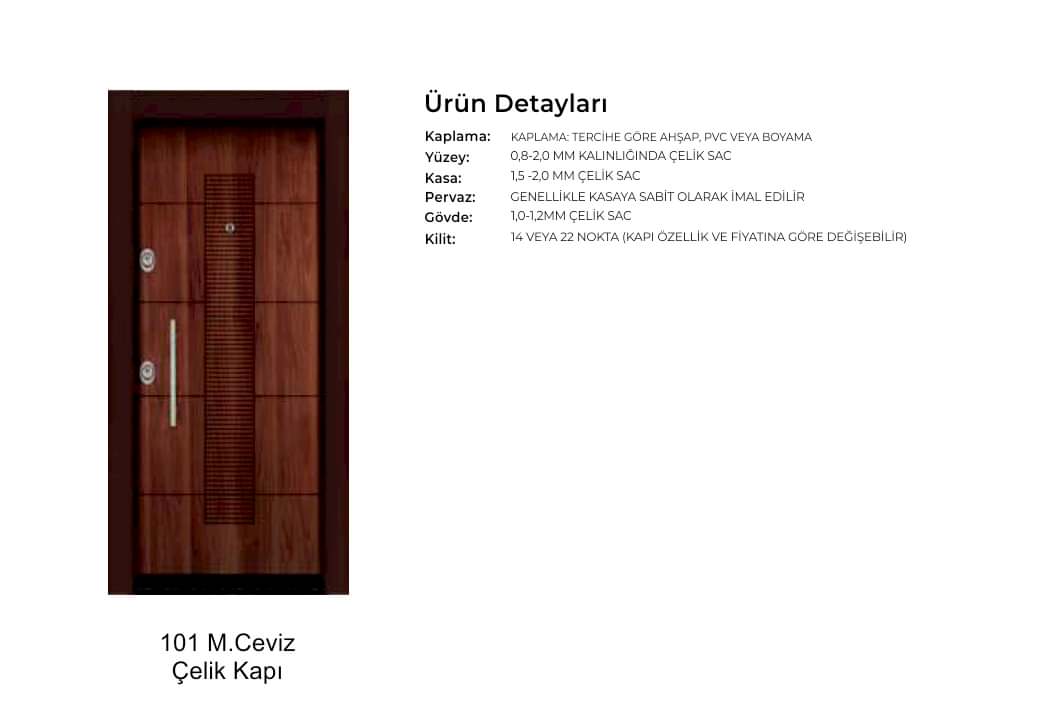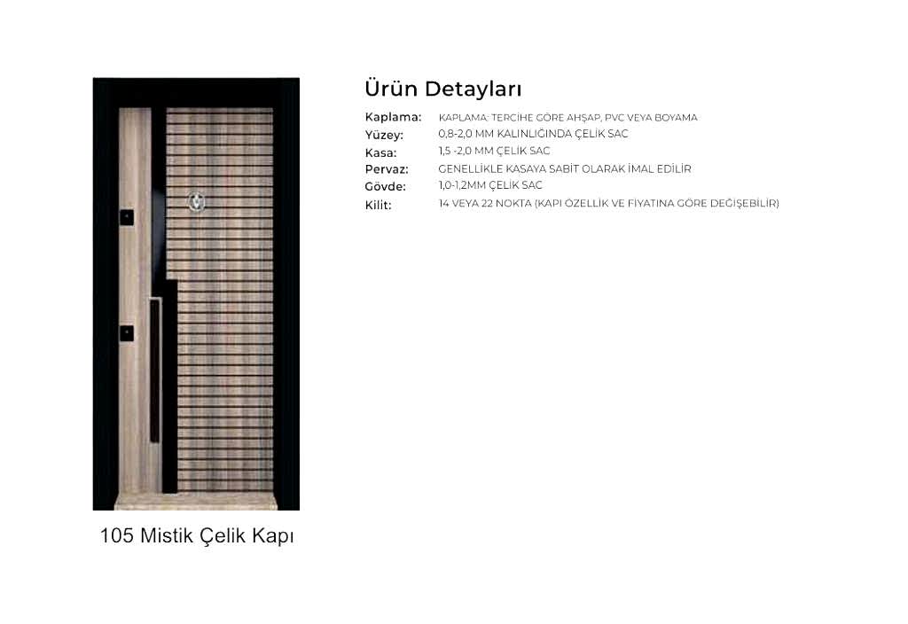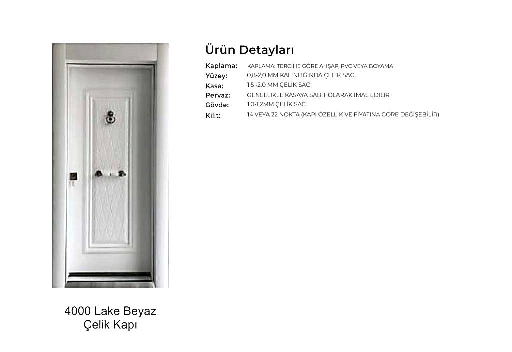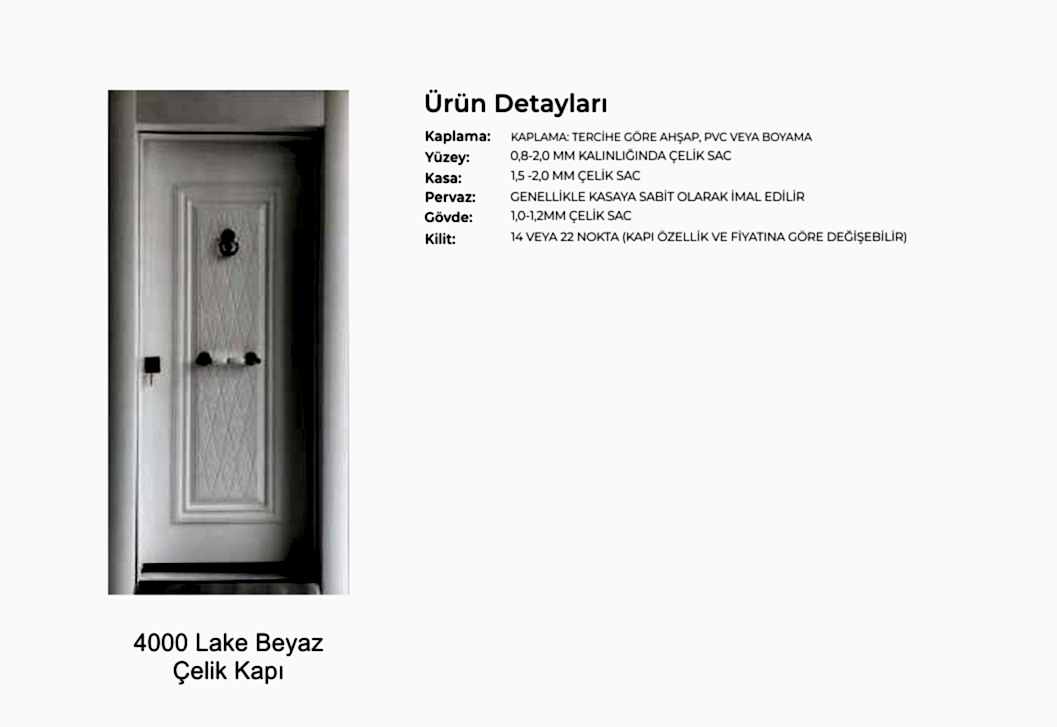 - Kapılarda standart olarak kaliteli malzemeden 180 derece dürbün, kapı kolu kullanılır. Farklı renk ve tip aksesuarlar opsiyonel olarak uygulanmaktadır.