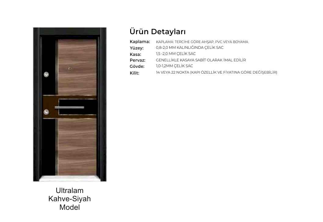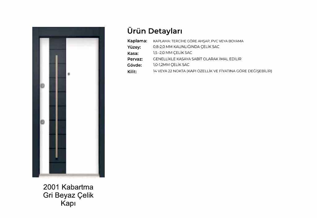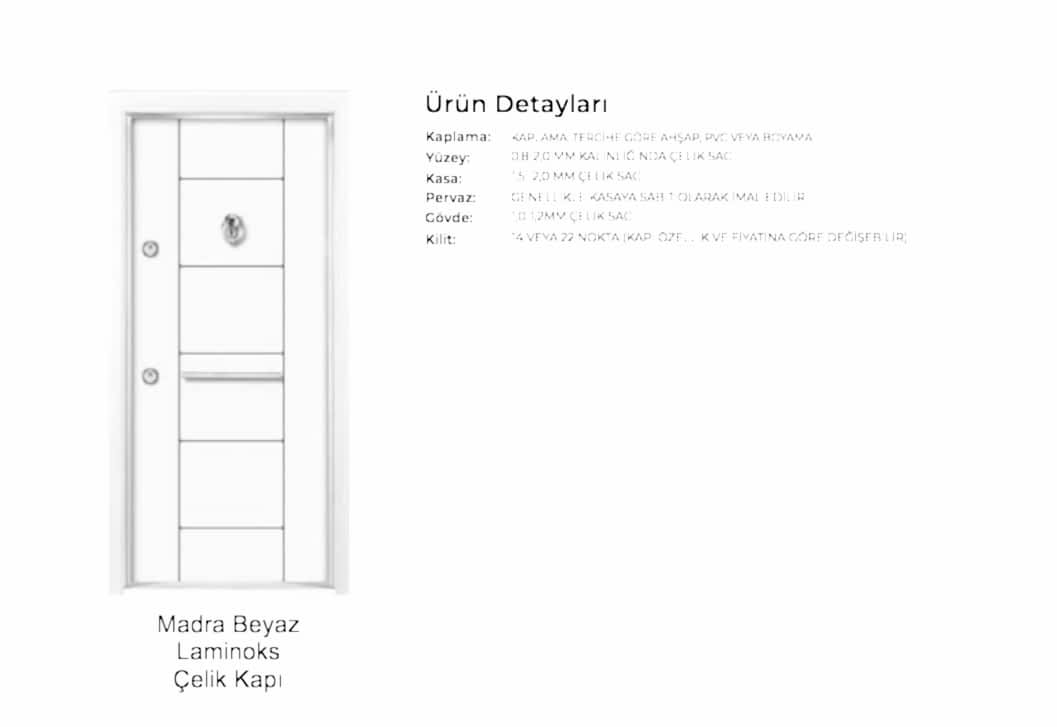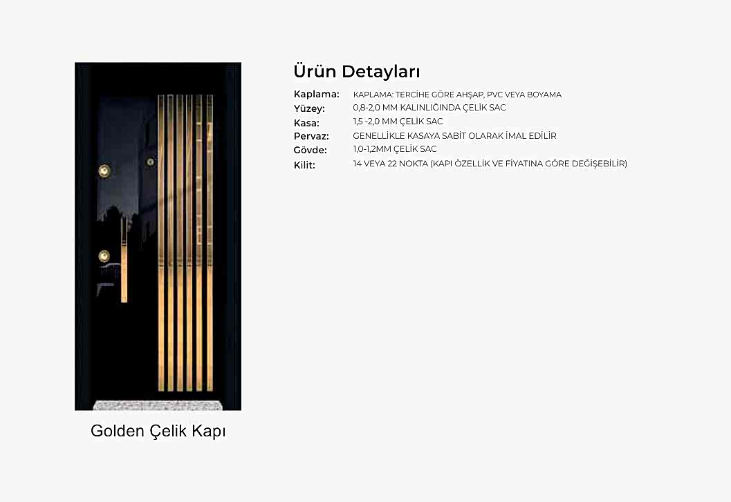 - Kapı serenleri 1.5 mm kalınlığında profilden, güvenlik noktalarında 6.5 mm kalınlığa ulaşan niteliktedir. Kanat içi 0,70 mm sac ile desteklenmiştir.