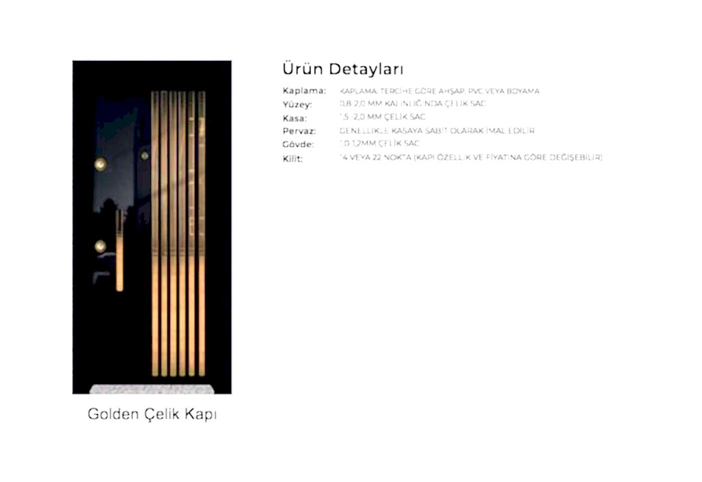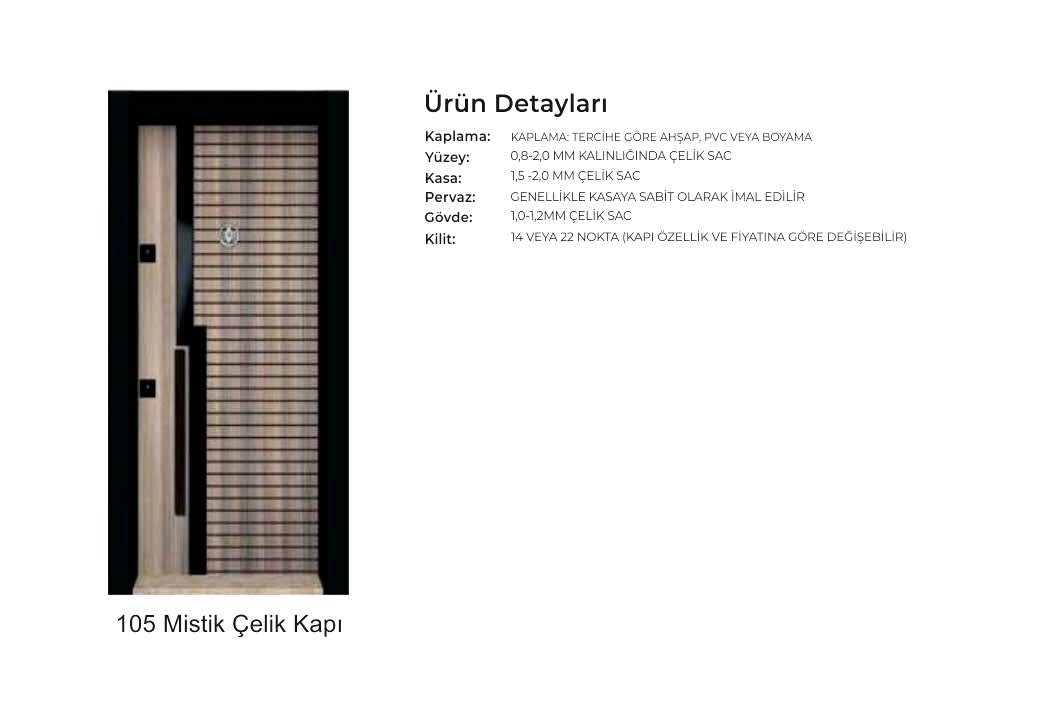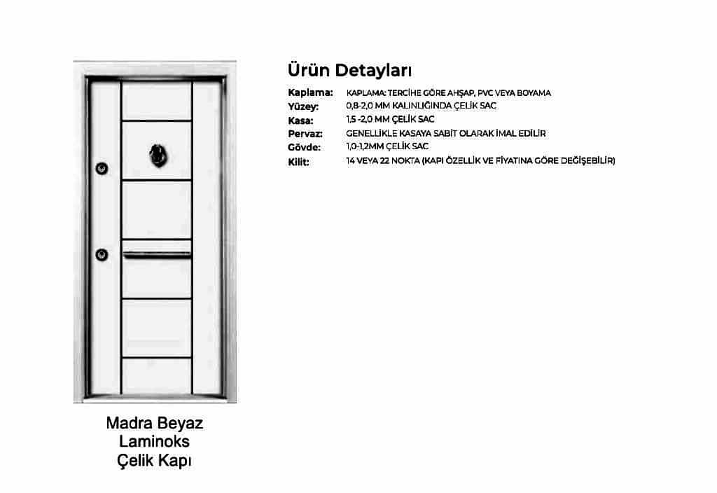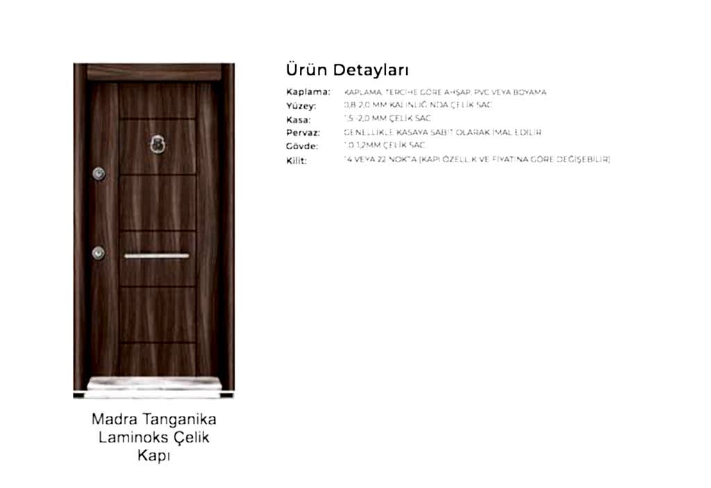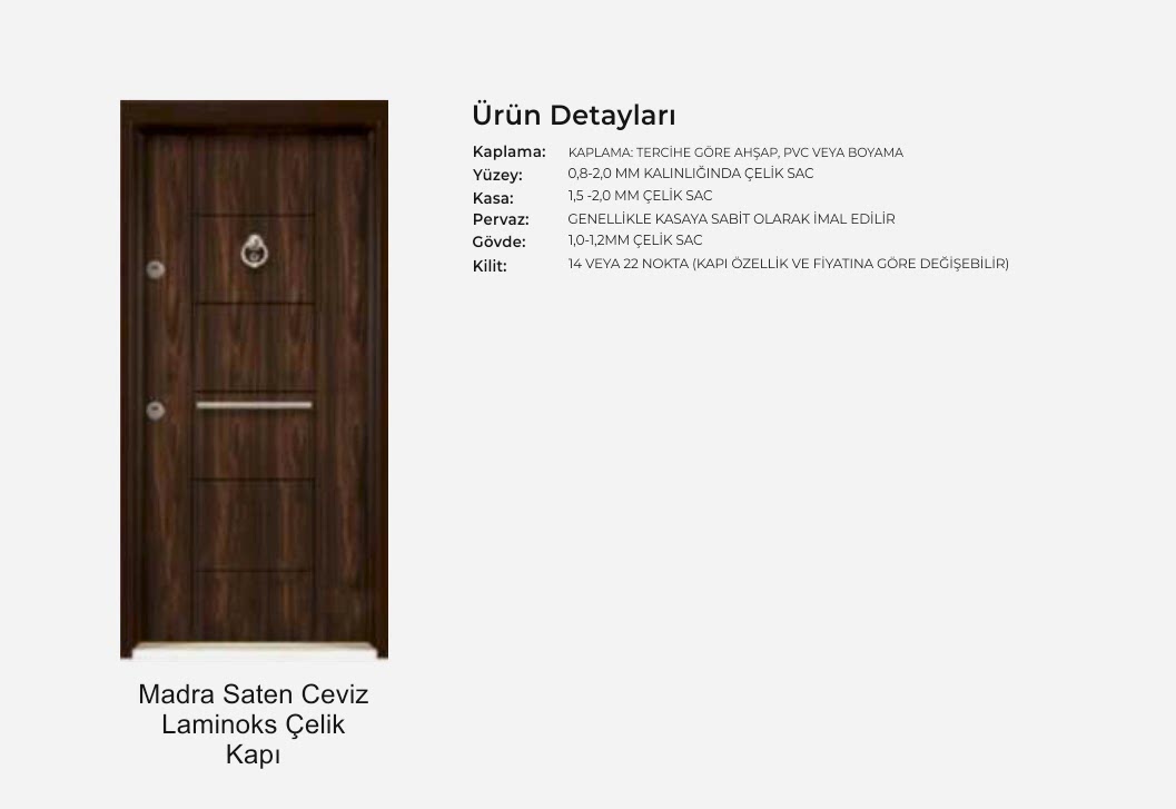- Kapı serenleri 1.5 mm kalınlığında profilden, güvenlik noktalarında 6.5 mm kalınlığa ulaşan niteliktedir. Kanat içi 0,70 mm sac ile desteklenmiştir.